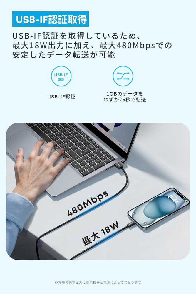 データ転送速度:MAX480Mbps、充電速度:MAX18W