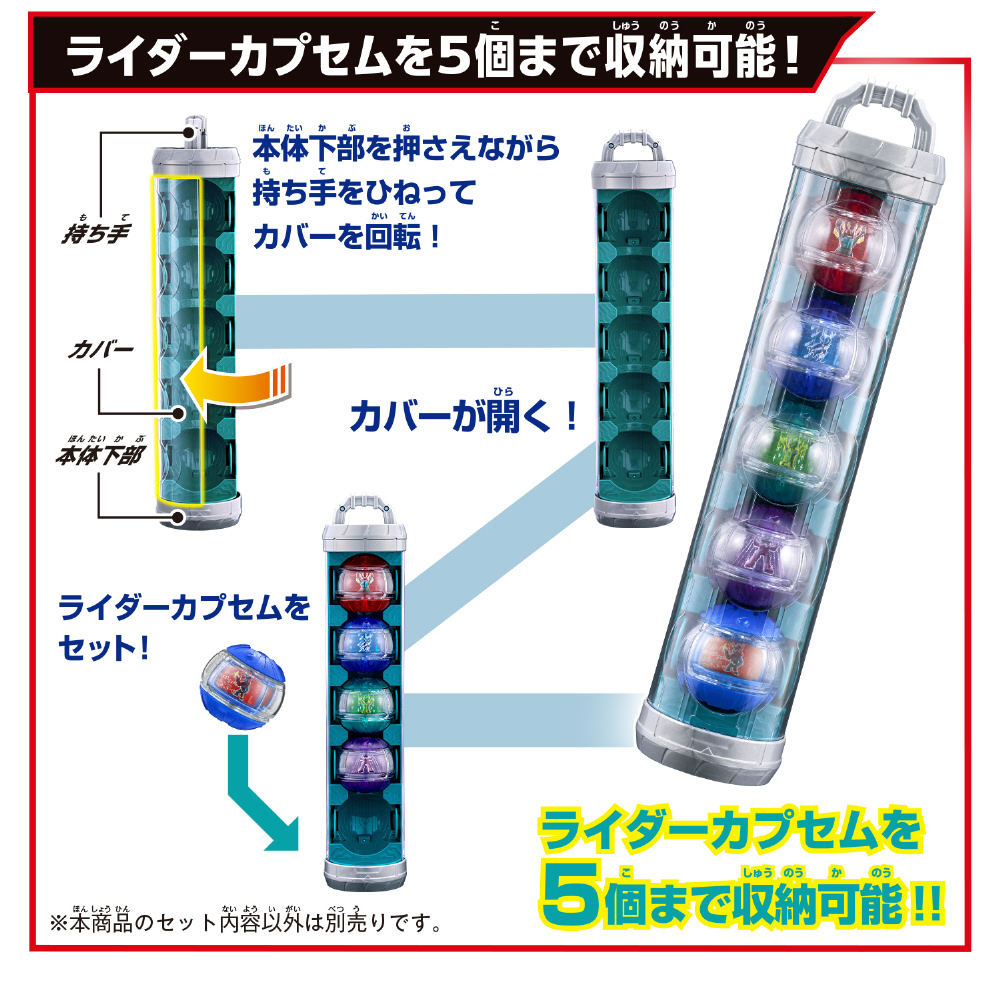 ライダーカプセムシリーズを5個までセットできる収納ケースです。