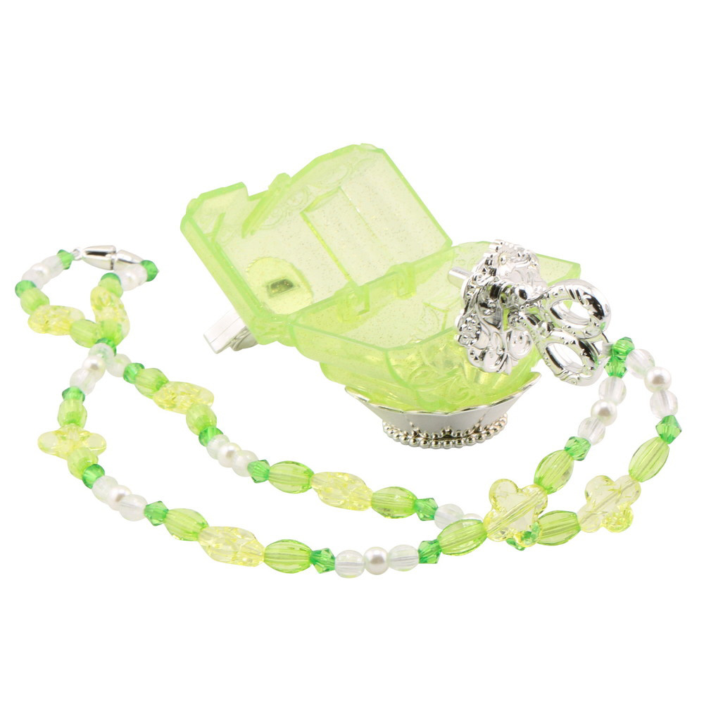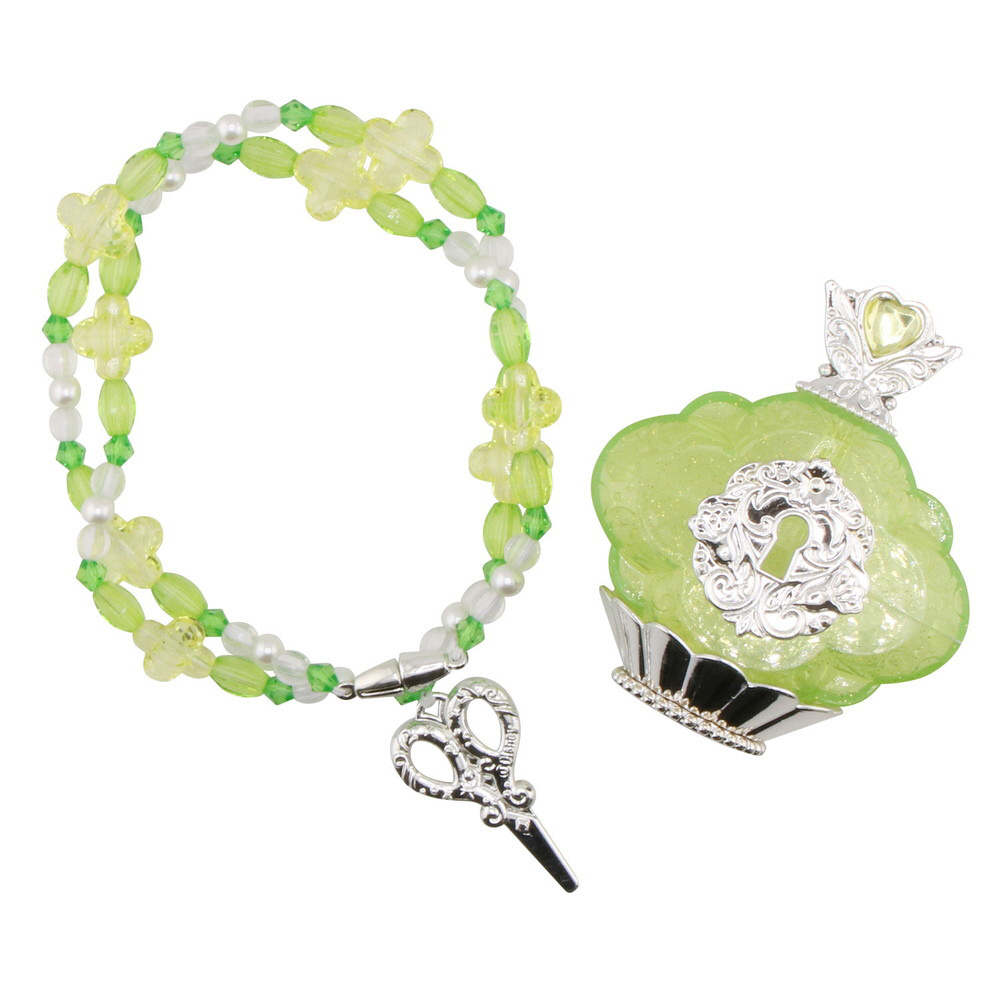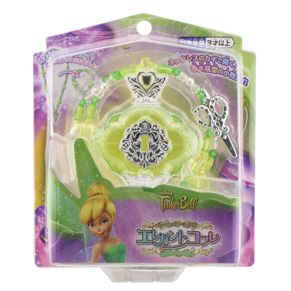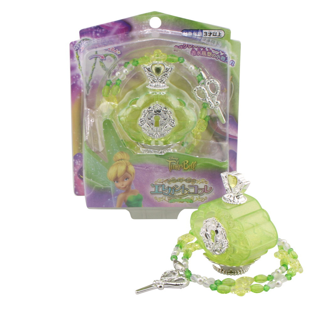ティンカーベルをイメージしたネックレスと香水瓶型の小物入れがセットになった商品です。