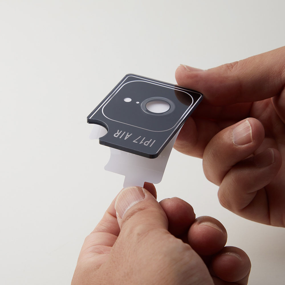 装着には再剥離可能な両面テープを使い、しっかりと固定できます。プロテクターの縁に作られた溝に爪を引っかけることで容易に取り外せます。