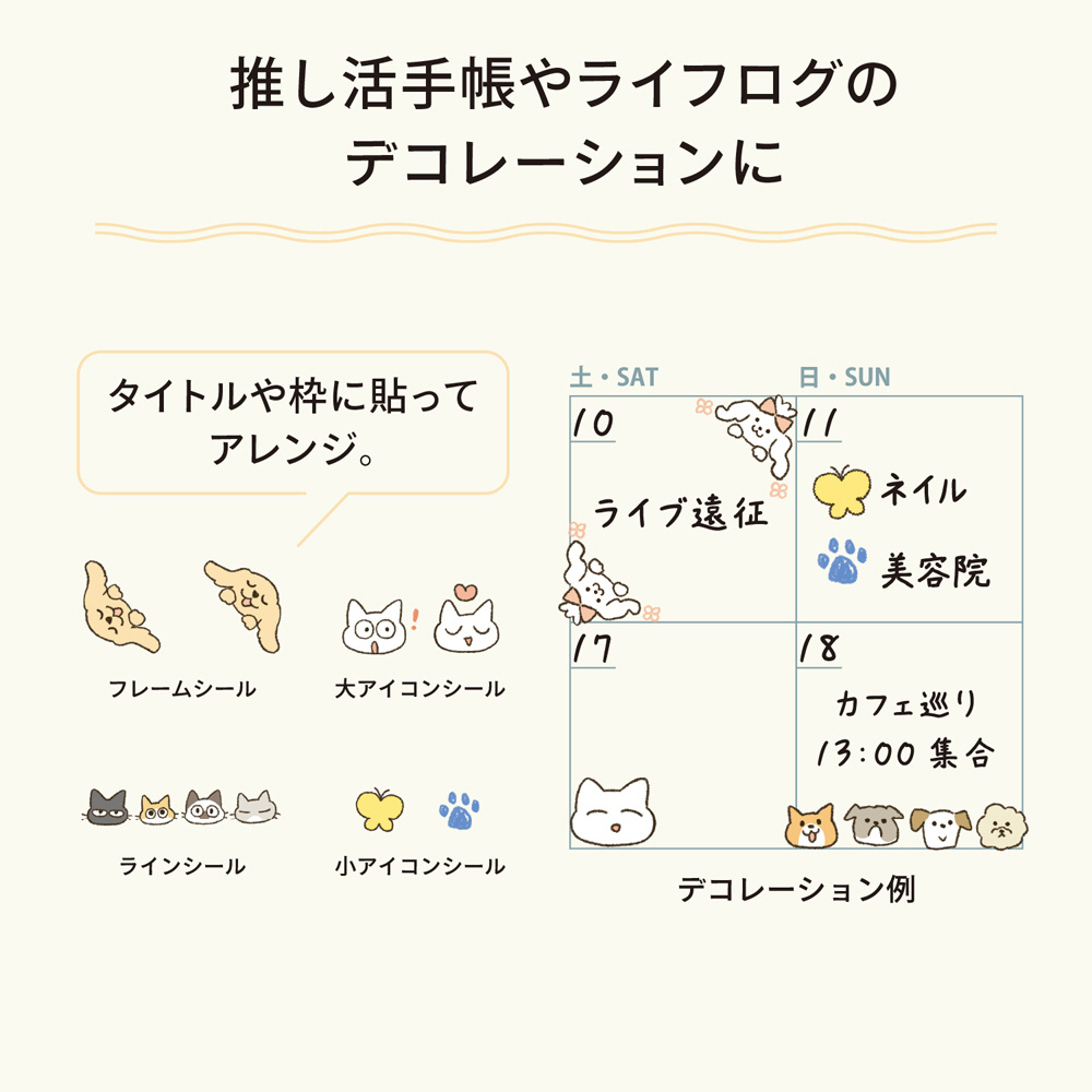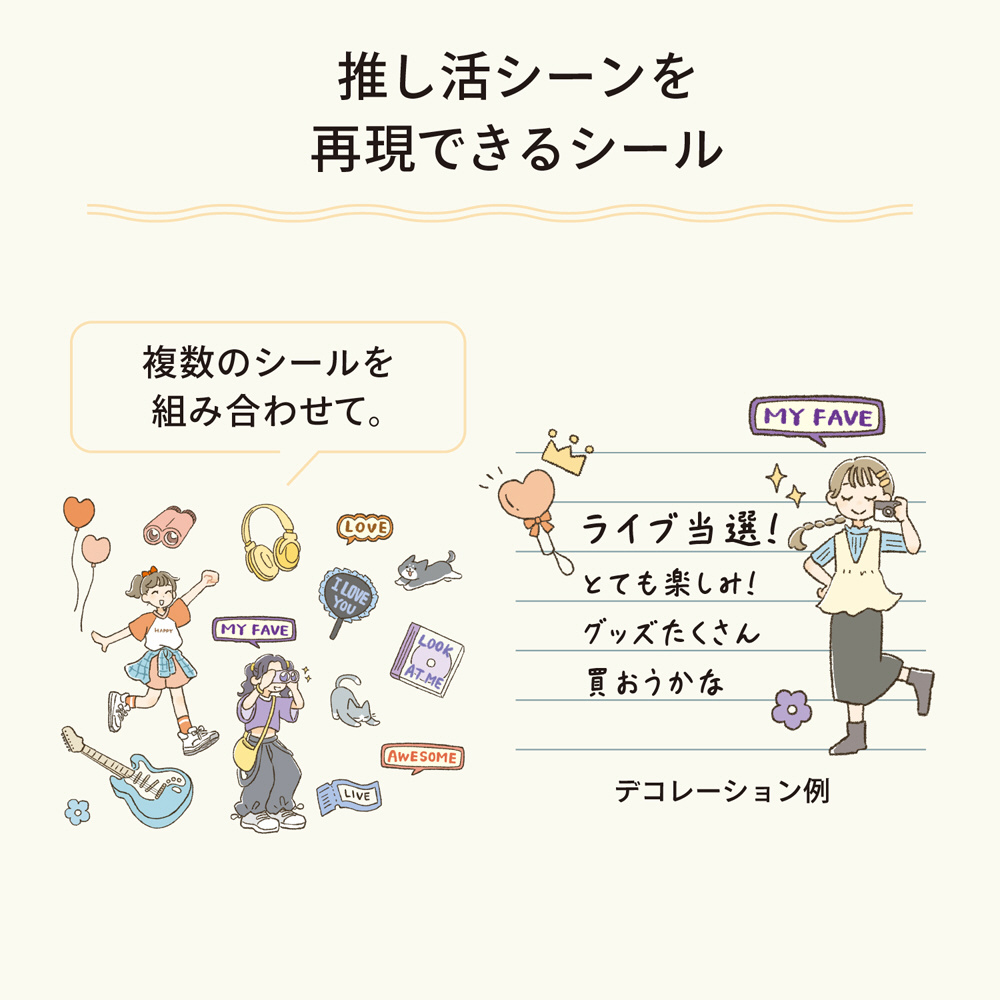 複数のシールを組み合わせることで推し活のひとコマを再現できます。