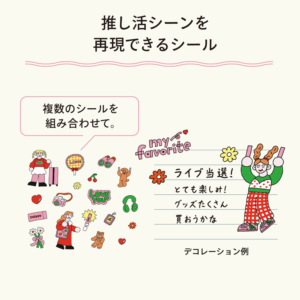 複数のシールを組み合わせることで推し活のひとコマを再現できます。