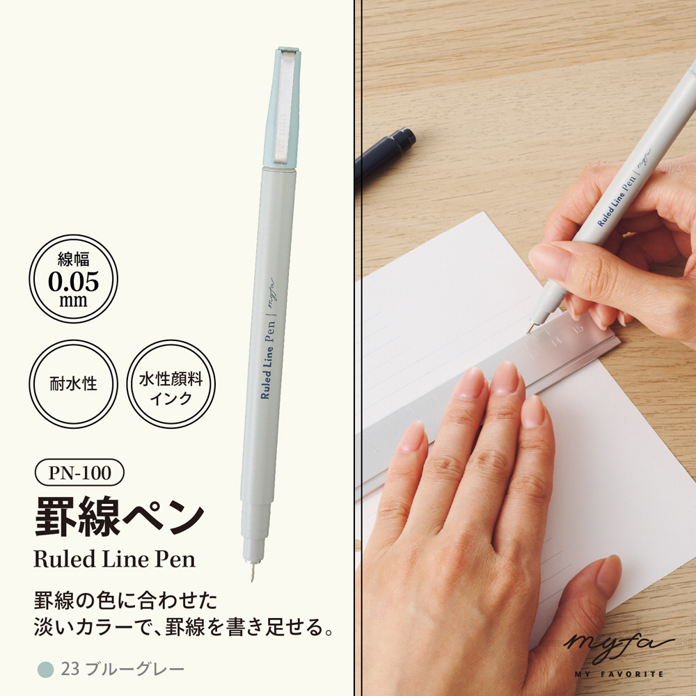 罫線を書き足す極細ペンが登場!罫線の色に合わせた淡いカラーのペンで、罫線を書き足すことができます。線幅0.05mmの極細ペン先で細い罫線が引けます。耐水性がある水性顔料インクで上からマーカーで色を塗っても滲みにくいライフログにぴったりなペンです。