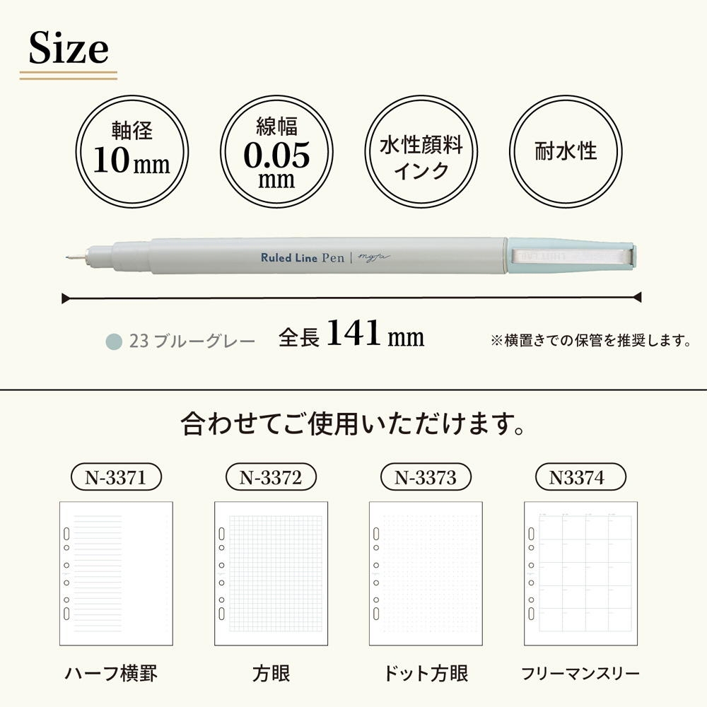 ノートの罫線と親和性が高いブルーグレーの極細ペン(0.05mm)です。同じシリーズの「アレンジペーパーリフィル」の罫線と同じ色を採用しています。