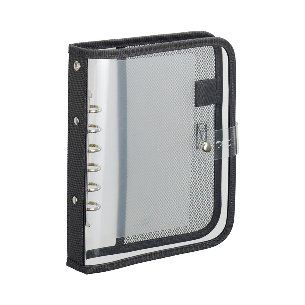 お気に入りのコレクションを表紙にできる!クリアタイプのバインダー。表紙が透明なので、中に収納したお気に入りのコレクションを見せることができます。缶バッジが付けられるメッシュポケット、ペンホルダー、着脱しやすい下敷きが付いております。JIS規格の多穴リーフもとじられるミニ6穴とじ具のバインダーです。背にはキーホルダーが付けられるストラップホール付き!