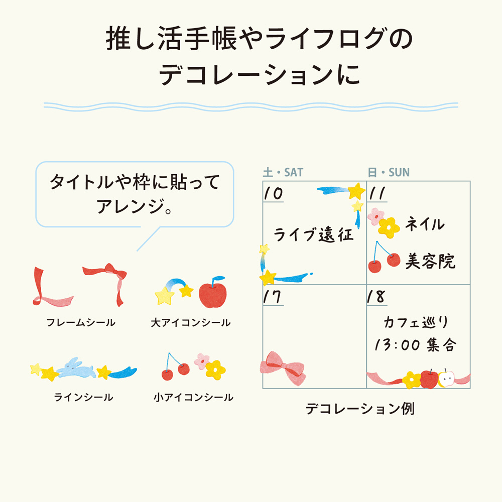 推し活をより楽しく!ライフログにぴったりなマスキングテープ素材のシールができました。5名のクリエイターとコラボレーションしたマスキングテープ素材のシールで、推し活やライフログノートのデコレーションにおすすめです!フリーマンスリーやタイトルに貼ってアレンジできるフレームシールや、推し活をしている様子を再現できるシチュエーションシール等が入っています。
