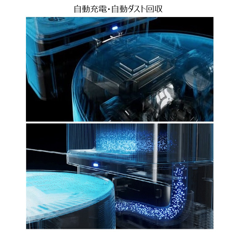本体及びリモコンのスイッチ一つで簡単スタート、清掃後はステーションに戻り充電とダスト回収を自動実行