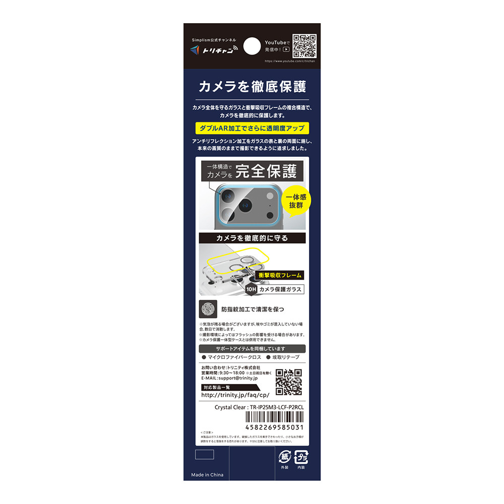 カメラ全体を守るガラスと衝撃吸収フレームの複合構造で、カメラを徹底的に保護する、一体型構造のレンズ保護ガラスです。