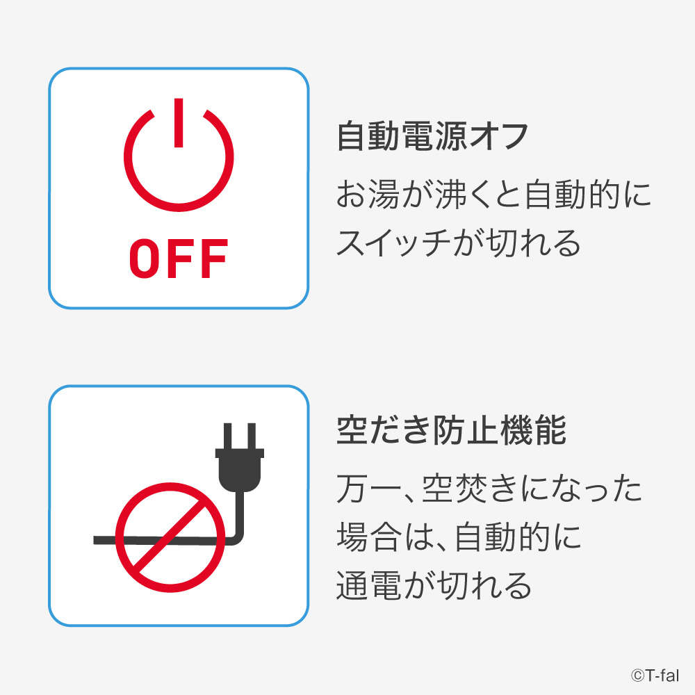 「転倒お湯もれロック機能」「省スチーム設計」「自動電源オフ機能」「空焚き防止機能」