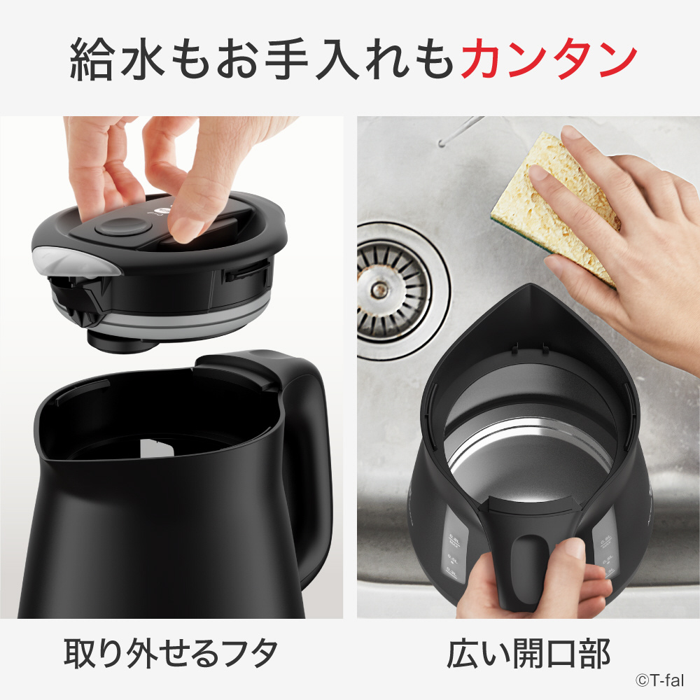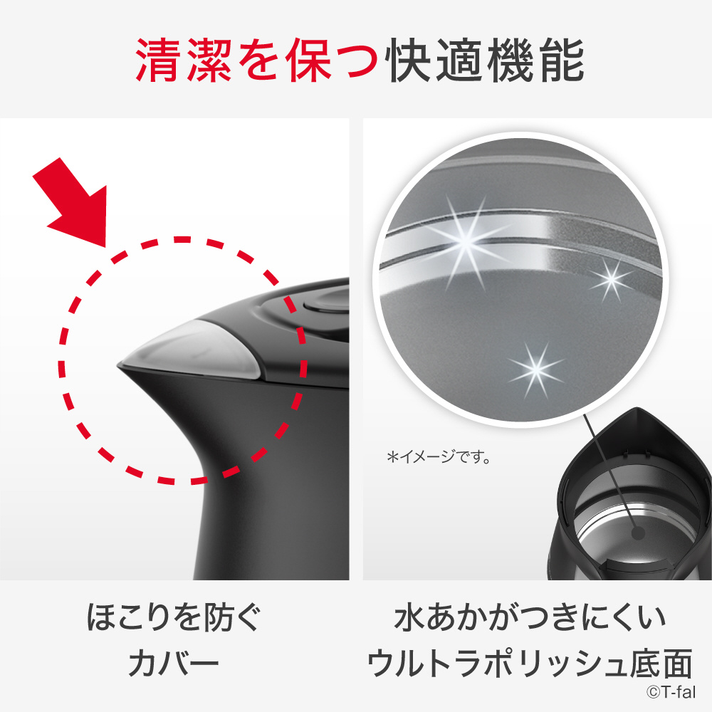 「注ぎ口カバー付き」「水垢が付着しにくい底面」「内部の手入れや給水がラクラク、広い間口」