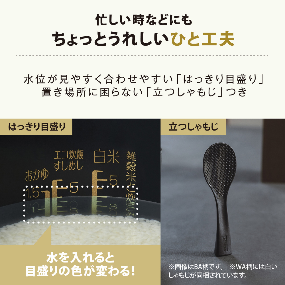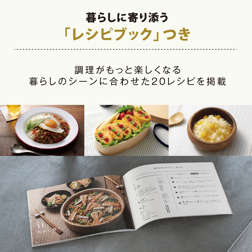 立つしゃもじ・白米用計量カップ(約180mL = 約1合)・取扱説明書(お料理ノート・保証書)