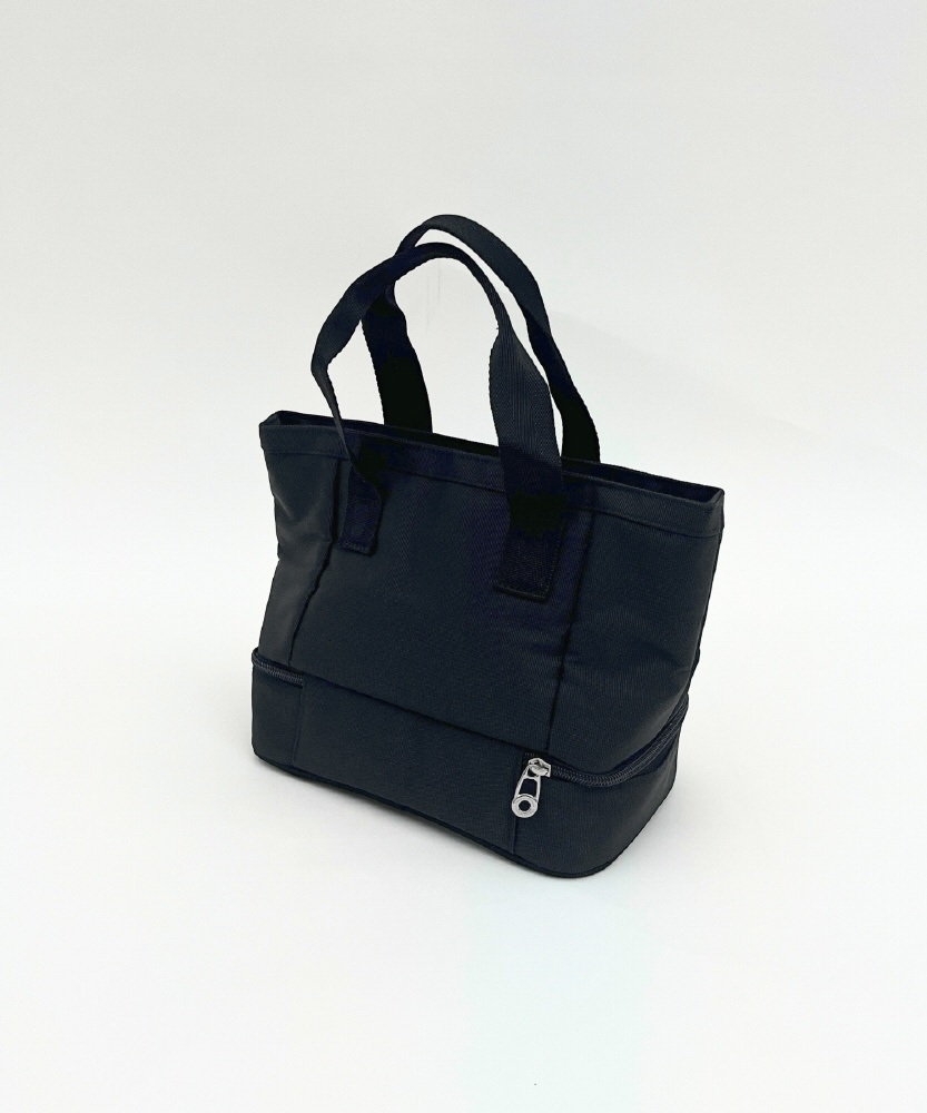 ・二層式仕様で底部に保冷裏地仕様のポケットがついており、保冷剤や冷たいドリンクなどの収納に便利です。