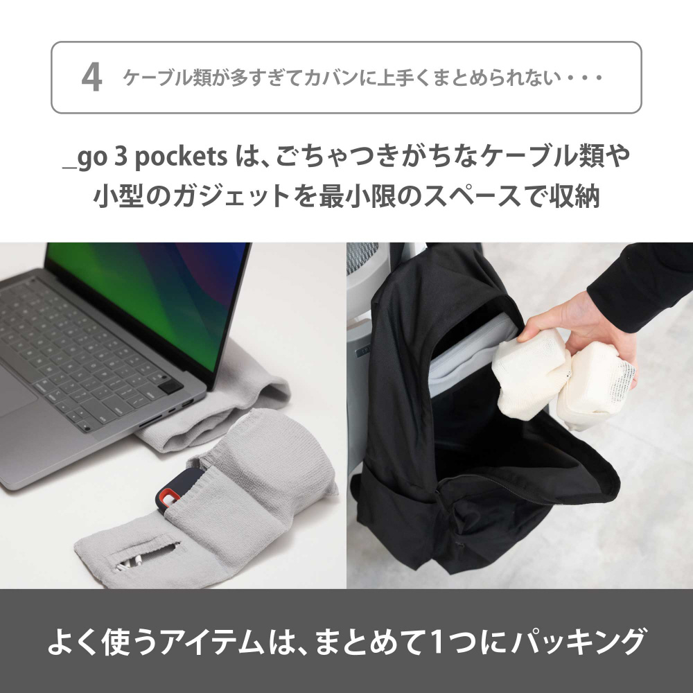 2つ目のポケットは充電機器用にするなど、自在にアレンジ!