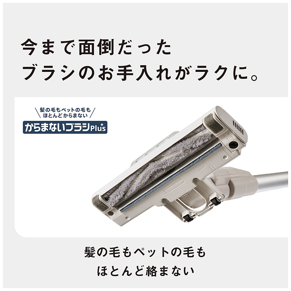 ブラシに髪の毛やペットの毛がほとんどからまずお手入れがラク。LEDライトでゴミを逃さない。手入れしやすいフラットな収納スタンド付き
