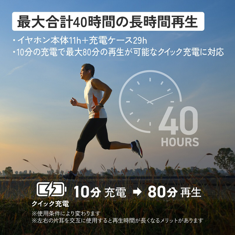 片耳約6.0gの軽量・小型ボディながら、本体のみで最大11時間※2の連続再生が可能。さらに、充電ケースによるフル充電(最大29時間※2)と合わせると、最大40時間※2の長時間再生が可能です。