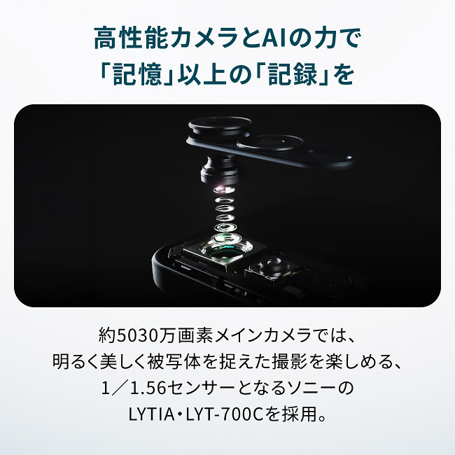 ■約5030万画素メインカメラでは、明るく美しく被写体を捉えた撮影を楽しめる、1/1.56センサーとなるソニーのLYTIA・LYT-700Cを採用。さらに、光学手ブレ補正機能を搭載。超広角カメラとインカメラはともに約4990万画素カメラを搭載し、様々なシーンを高画質で美しく切り取れます。