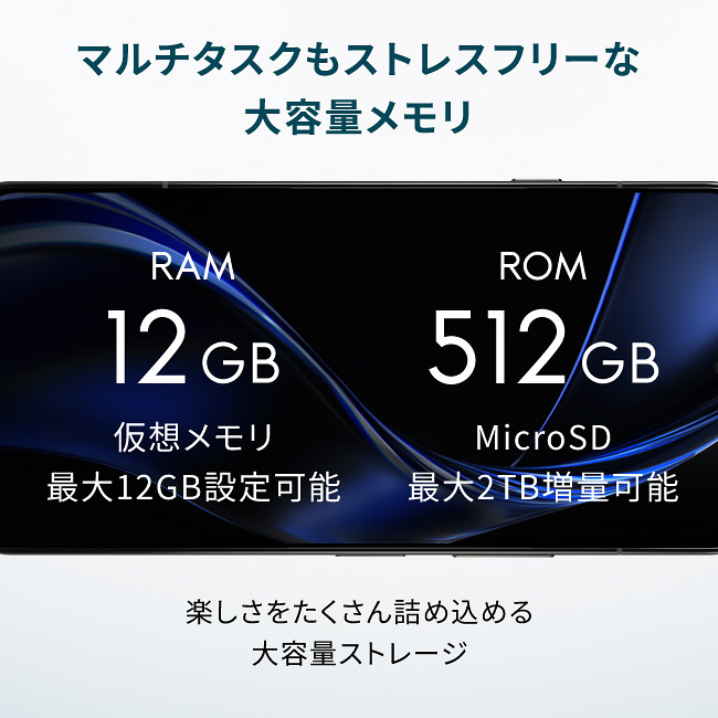 ■快適なAI体験や高いグラフィック性能が必要なゲームを存分に楽しめる、arrows史上最高性能となる「Dimensity 8350 Extreme」チップ採用。また、arrows史上最大保存容量のROM512GBと、快適な動作のために必要なRAMを12GB搭載し、仮想メモリも12GBまで拡張可能なので永く快適にご利用いただけます。