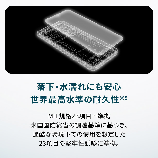 へ落下させても画面が割れにくい構造、I P6Xの防塵性能とIPX6/8/9の最高水準の防水性能で守られています。