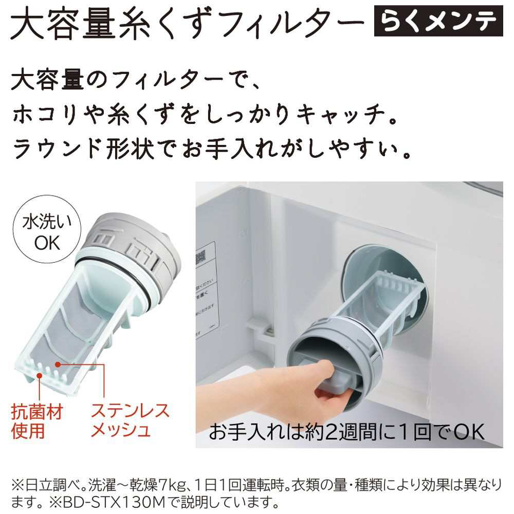 面倒だった乾燥フィルターのお手入れは不要になりました。乾燥時のホコリや糸くずは、次の洗濯運転時に、3つの自動おそうじ機能で洗い流して、[大容量糸くずフィルター]で捕集します。お手入れがしやすいラウンド形状で、お手入れの頻度は約2週間に1回でOK(※1)。また、洗濯槽・乾燥経路・ドアパッキンの3つを強力洗浄する「らくメンテ洗浄」コース(槽洗浄4時間)も搭載しています(※2)。
