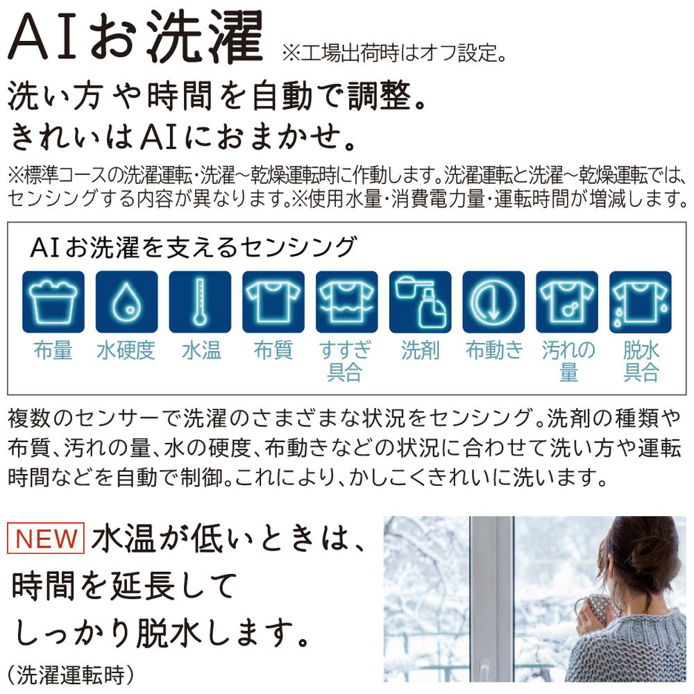 ・洗い方や時間を自動で調整。洗濯運転時、水温が低い時は、時間を延長してしっかり脱水「AIお洗濯」(※)