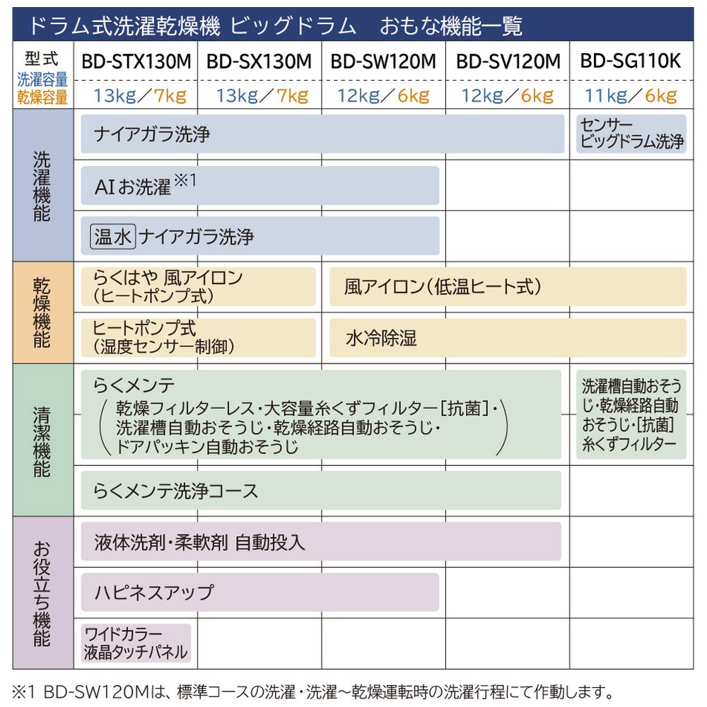 乾燥フィルターレスでお手入れがらく「らくメンテ」、高速風と大風量でシワを伸ばす「らくはや風アイロン」、高濃度と大流量で汚れをスッキリ「ナイアガラ洗浄」搭載。