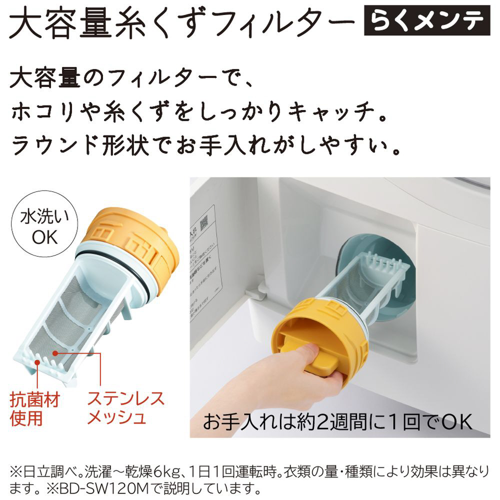 面倒だった乾燥フィルターのお手入れは不要になりました。乾燥時のホコリや糸くずは、次の洗濯運転時に、3つの自動おそうじ機能で洗い流して、[大容量糸くずフィルター]で捕集します。お手入れがしやすいラウンド形状で、お手入れの頻度は約2週間に1回でOK(※1)。また、洗濯槽・乾燥経路・ドアパッキンの3つを強力洗浄する「らくメンテ洗浄」コース(槽洗浄4時間)も搭載しています(※2)。