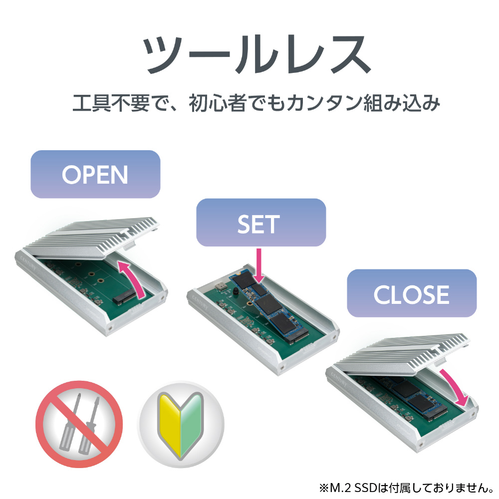 ■工具不要。ケースのフタを開けてSSDをセットするだけのカンタン組み込み。