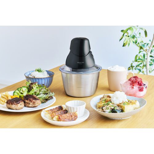■外形寸法:幅約159mm×奥行約159mm×高さ約210mm ■質量:約1.1kg(収納時) ■消費電力:320W ■付属品:みじん切りカッター(カッター保護カバー付き)、両面おろし刃、バター&ホイップ、円板軸 ■定格時間(連続使用可能時間):1分(1分動作後は15分休止) ■容器容量:300g(液体含む) ■カラー:ブラック ■コード長:約1m ■主材料:本体:ABS、ボトル:ステンレス