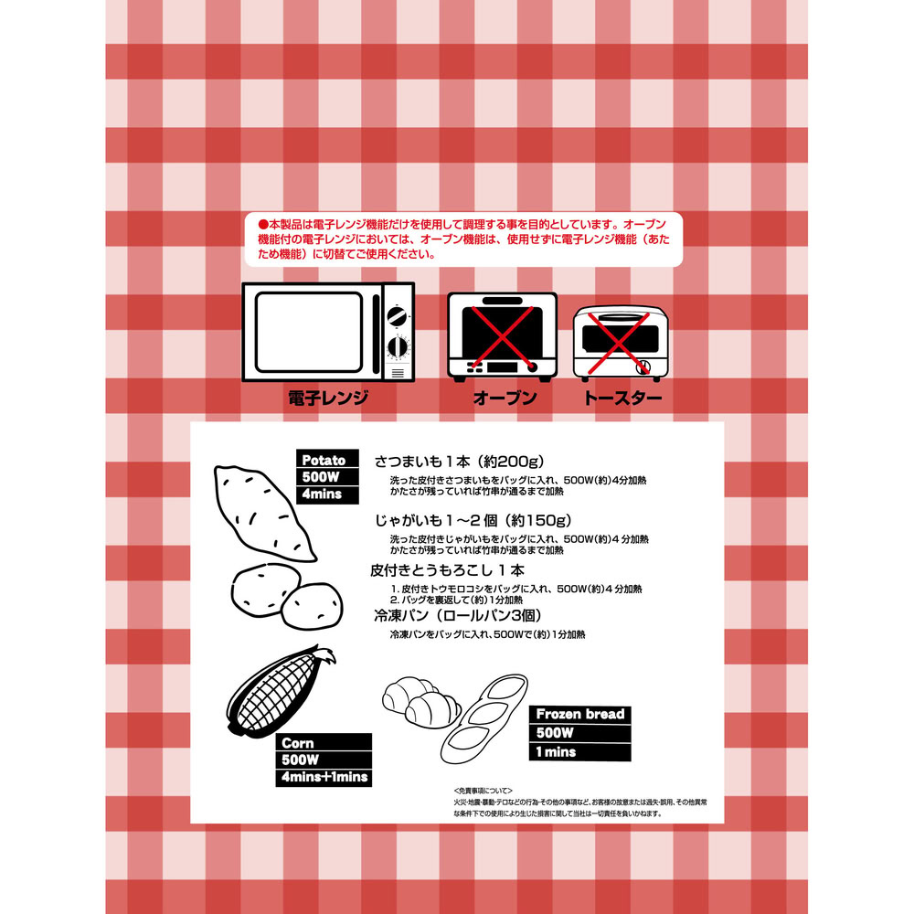 さつま芋1本(約200g):洗った皮付きさつまいもをバッグに入れ、500W(約)4分加熱。かたさが残っていれば竹串が通るまで加熱。