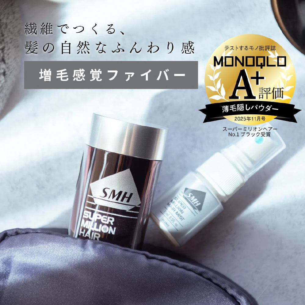 ●自然で立体的なヘアスタイルに: スーパーミリオンヘアーは独自力ットされた植物系繊維でできており、静電気によって髪や地肌に立体的に付着することで、まるで地毛のようなふんわりとしたヘアスタイルを演出します。