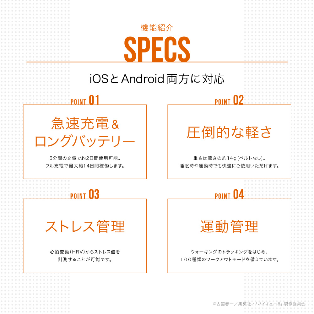 また、心拍数が一定以上になると横断幕「繋げ」の文字が浮かび上がり、通知が届くとネコのシルエットが出現するなど、毎日「ハイキュー!!」の世界を体感できます。