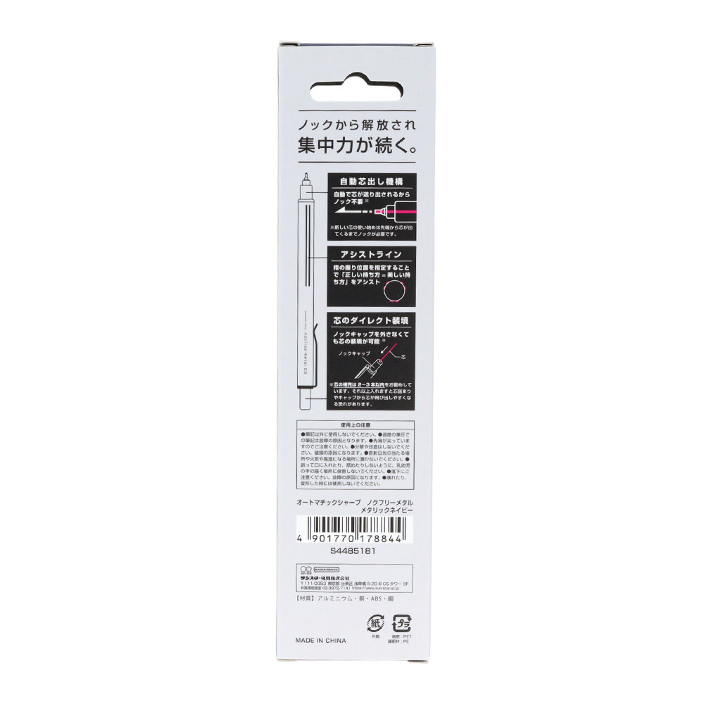 ライングリップが指の握り位置を指定することで「正しい持ち方」をアシスト、「オートマチックシャープ」。柄は、ノクフリーメタル。カラーは、メタリックネイビー。