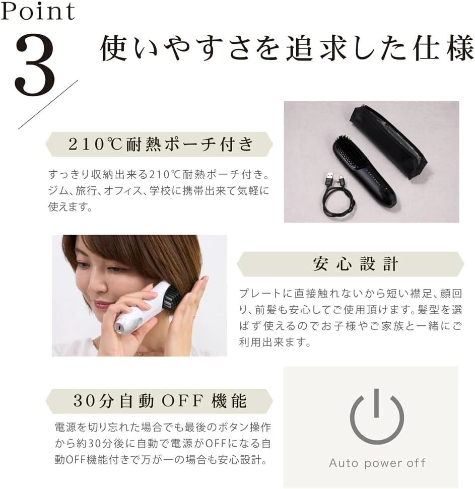 プレートに直接触れないブラシピン構造。短い襟足、 顔回り、前髪も安心してご使用頂けます。