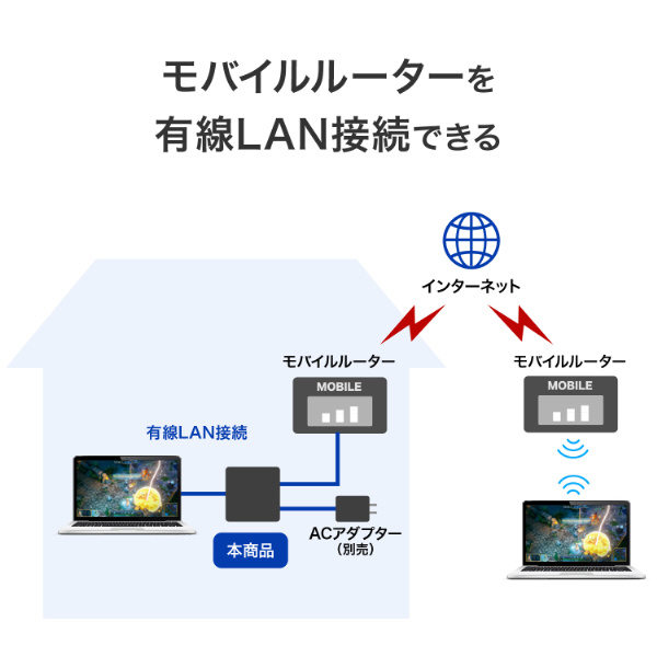 モバイルルーターに本商品を接続することで、有線LAN接続が可能です。外ではモバイルルーターとして持ち歩き、室内では本商品につないで固定ルーターのように使用すれば、内外でインターネット回線を共通化できます。