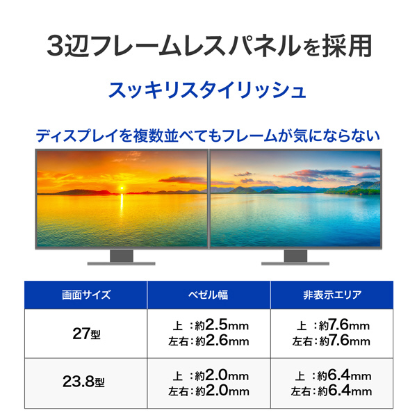 極細フレームですっきりした印象を与え、マルチディスプレイにもオススメです。