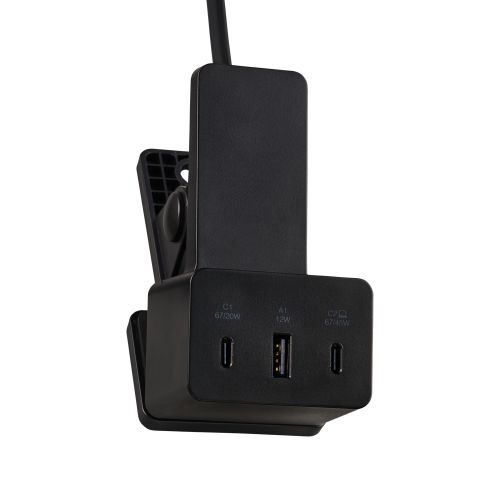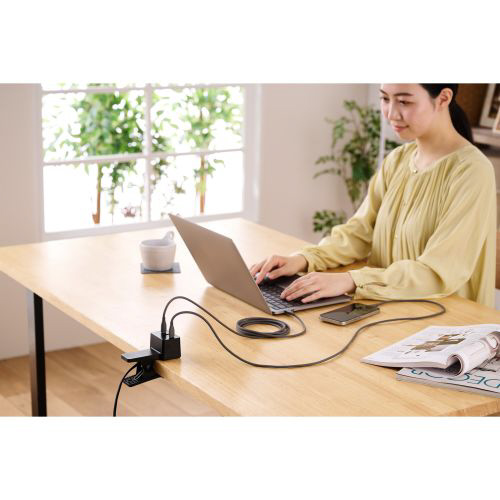 机などに挟んで使用できる、クリップ機構を備えたAC充電器です。2つのUSB Type-C(TM)ポートと1つのUSB-Aポートを搭載し、最大3台のデバイスを同時に接続できます。固定使用だけでなく、充電器を常設できないダイニングテーブルなどでテレワークや宿題をする際に、一時的に設置して利用するのにも便利です。