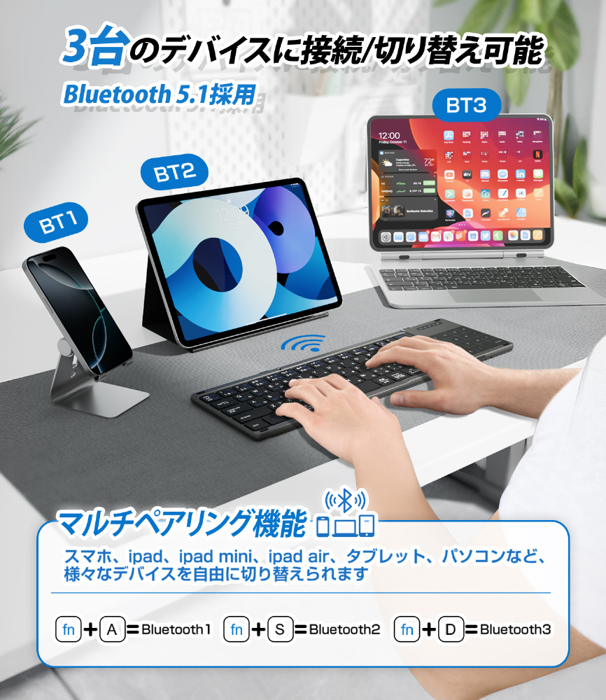 Bluetoothマルチ接続に対応し、スマホ・タブレット・PCなど最大3台まで同時にペアリング可能。ワンタッチで切り替えられます。