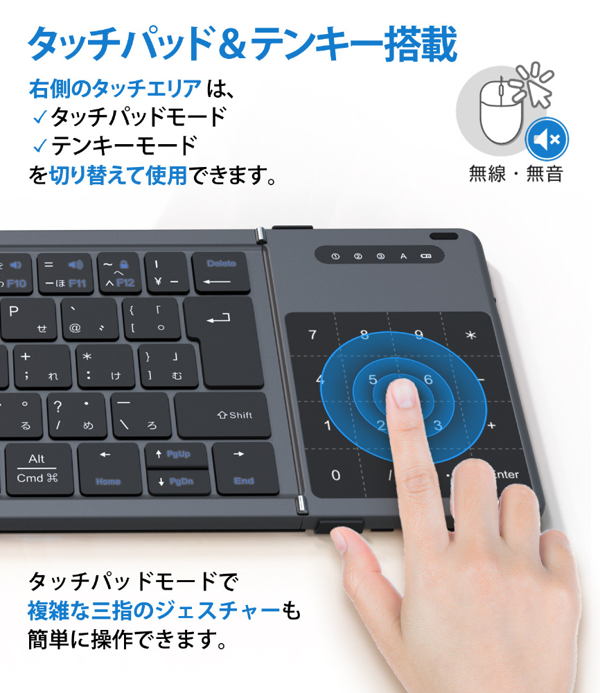 右側のタッチエリアはタッチパッドモード、テンキーモードをワンタッチで切り替えて使用可能。
