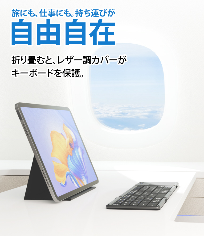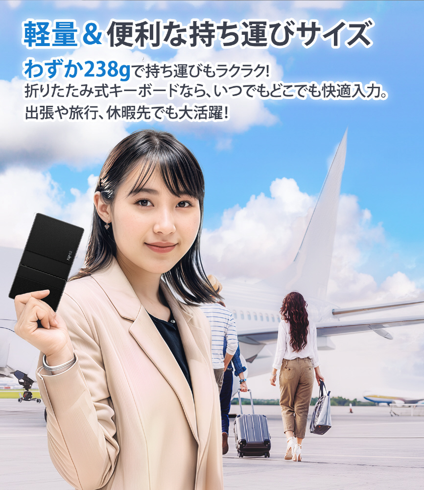 持ち運びに便利な三つ折りデザイン。238gと軽量で、バッグやポケットにも収納しやすく、外出先や出張でも活躍します。