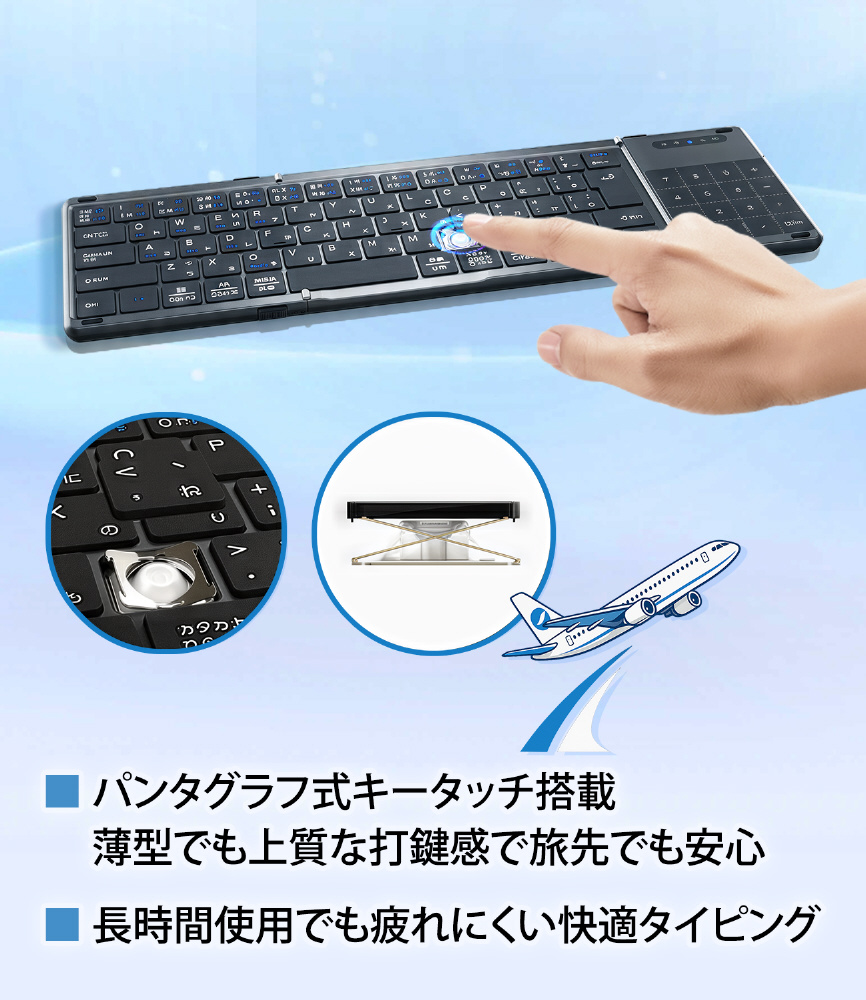 パンダグラフ構造と適度なキーピッチにより、ノートPCのような静かで心地よい打鍵感。