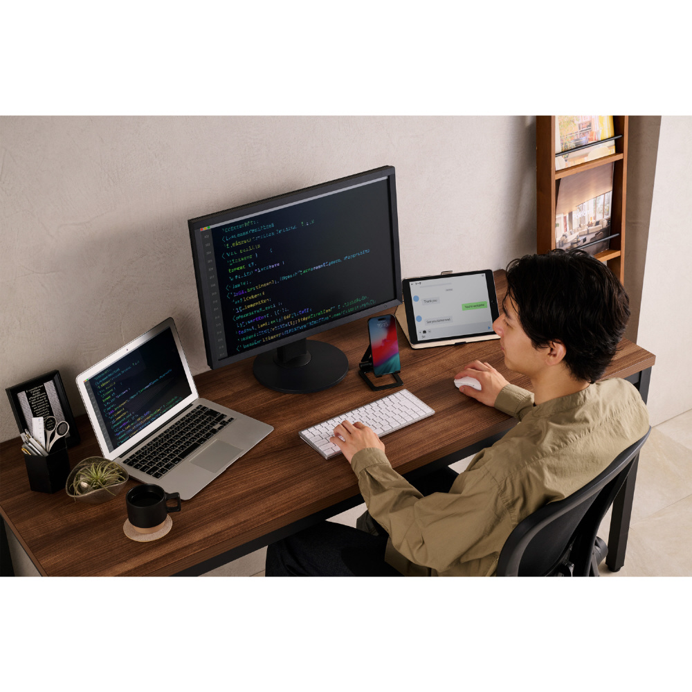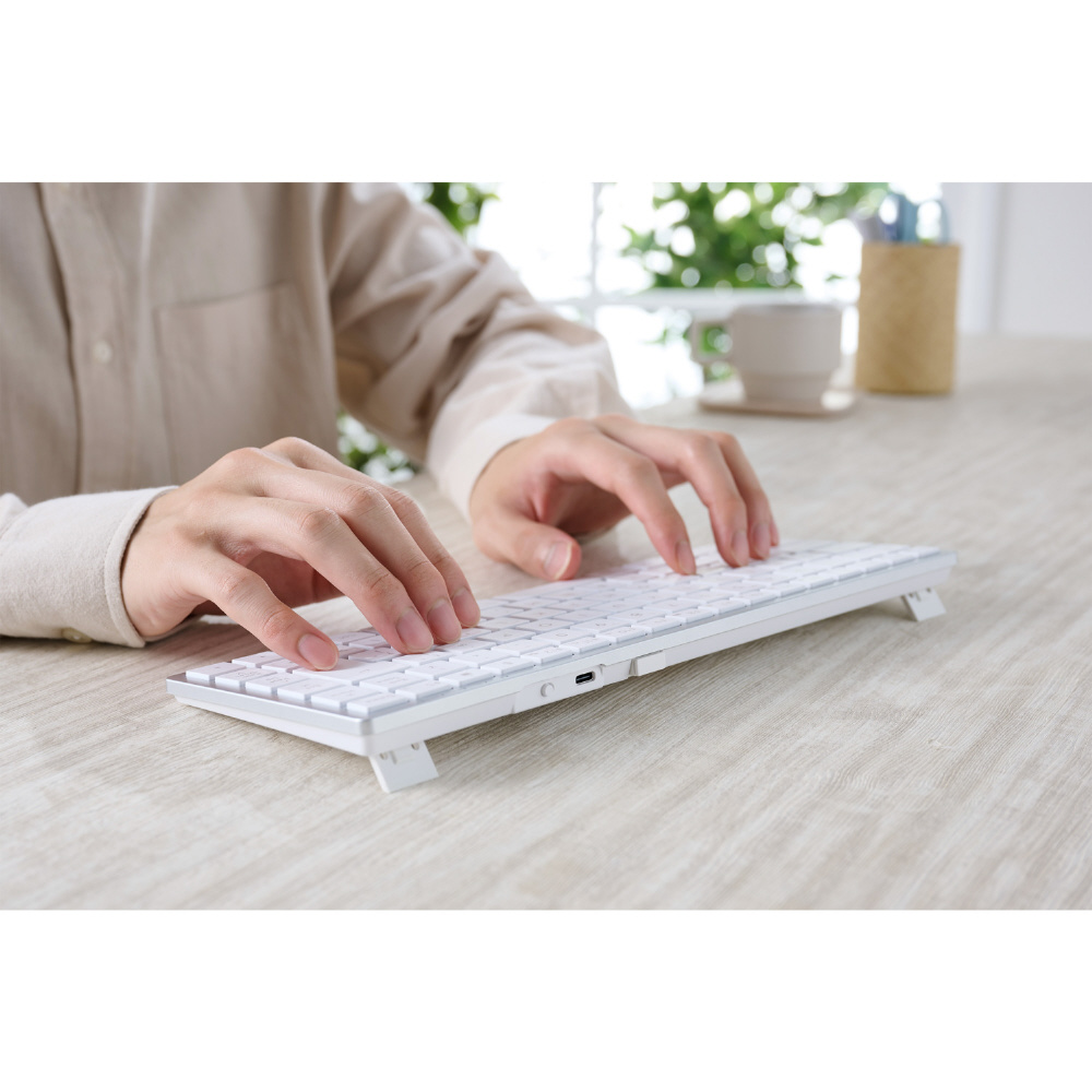 複数のデバイスをひとつのキーボードで操作可能。 最大4台のデバイスに接続できる、マルチペアリングに対応しています。 BluetoothR接続で3台、USB無線2.4GHzで1台まで接続機器を本体に保存でき、使用シーンに合わせてデバイスを瞬時に切り替えられます。
