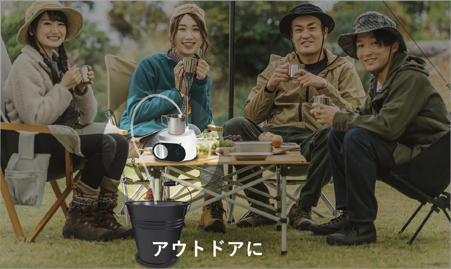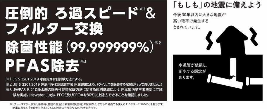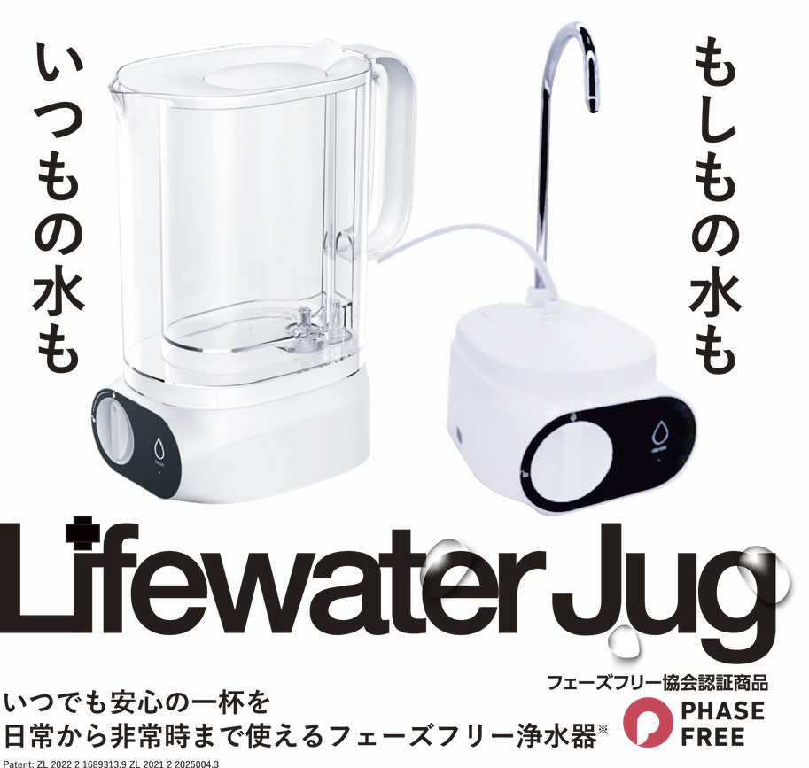 家庭用ポット型浄水器としての日常使用はもちろん、アウトドアにも使え、災害時にはお風呂の水も飲み水に変えるフェーズフリー設計の浄水器です。