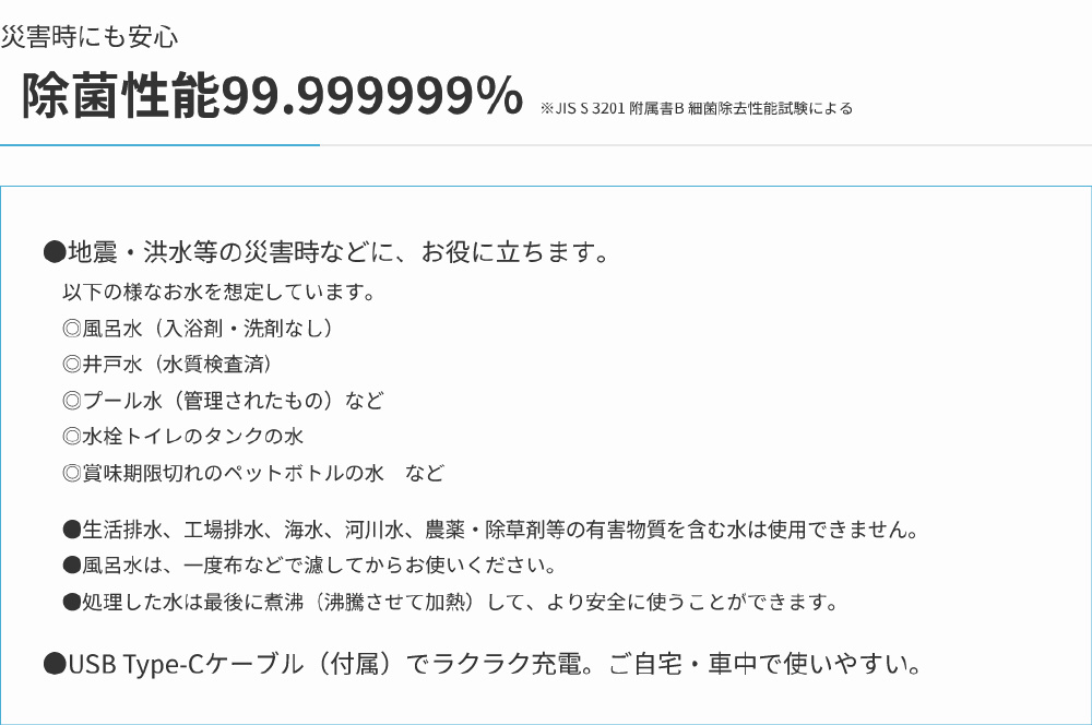一般的なポット型浄水器は、お風呂の水など水道水以外の原水を飲用にできません。「ライフウォータージャグ」は除菌性能と充電機能で、断水時でもお風呂の水などを飲み水としてお使い頂けます。