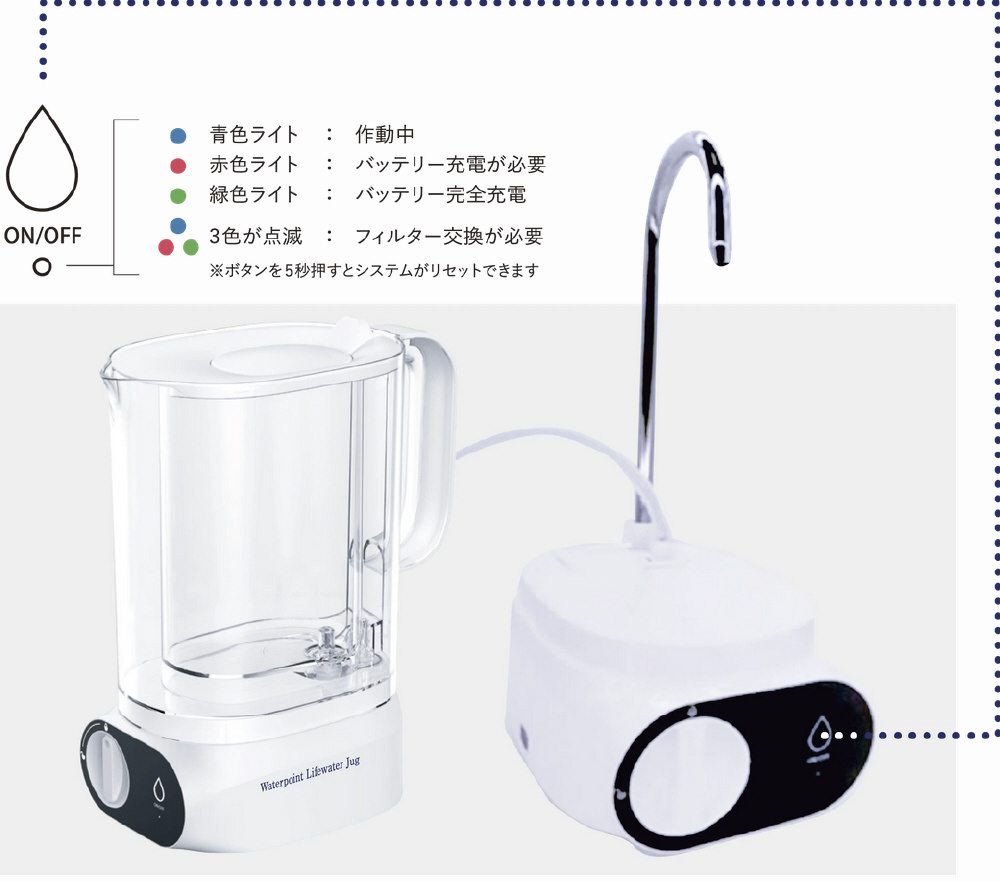 「ライフウォータージャグ」 は USB Type-C ケーブルからの充電式。モーターの力で、ポット型(自然ろ過)より圧倒的に速いろ過スピードを実現しました。※初期値