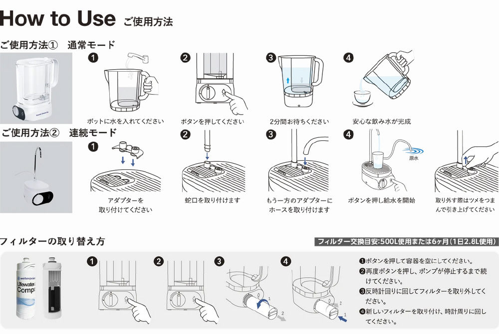 「ライフウォータージャグ」のフィルターはUF膜・活性炭を使用し、除菌性能に特化しています。さらに、2stepで交換できるカンタン設計です。