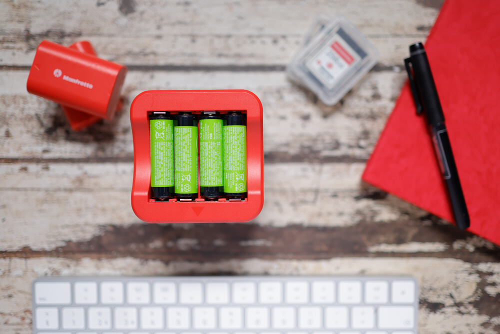 : 付属の単3充電池用プレートを使って、単3形充電池4本のチャージに対応します。2A出力のUSB Type-A端子を搭載し、外部デバイスへの給電・充電も可能です。