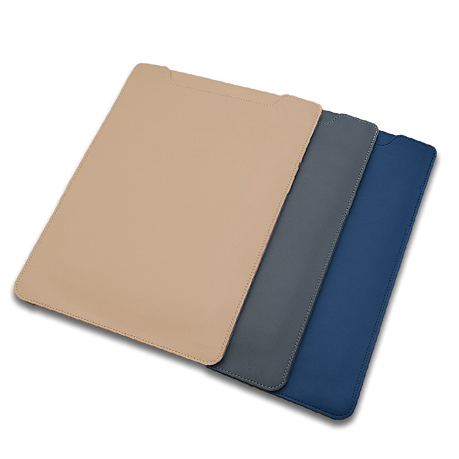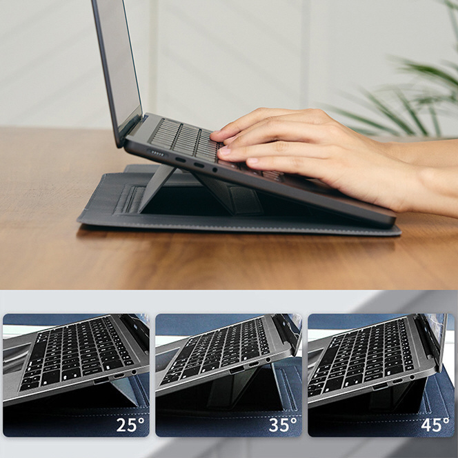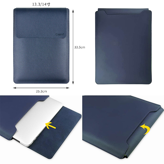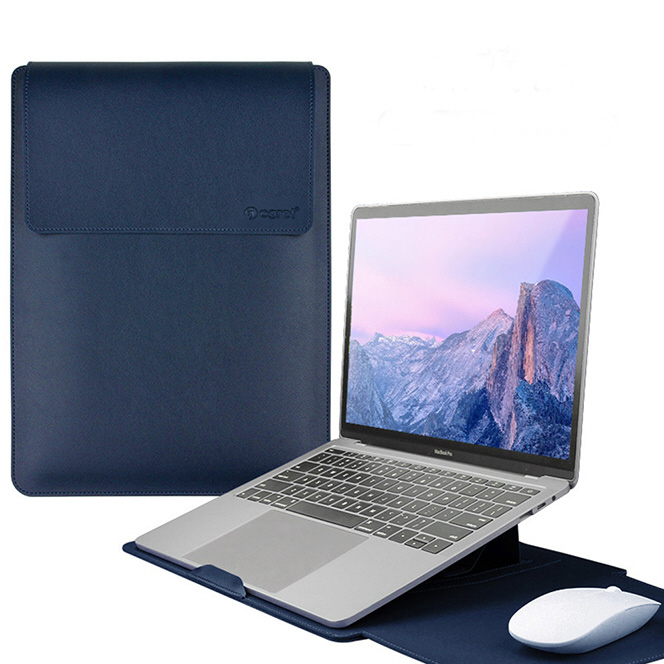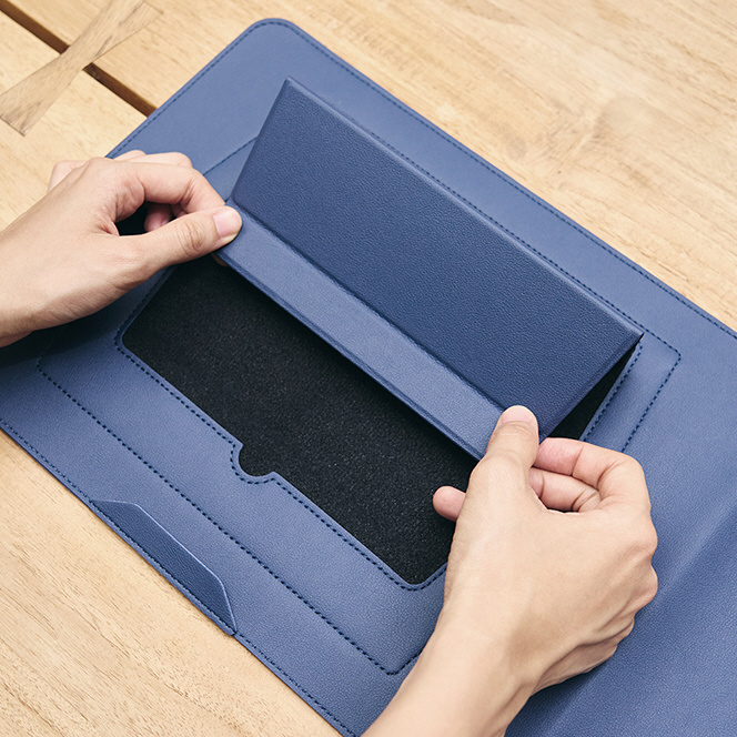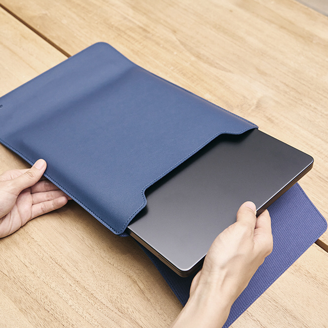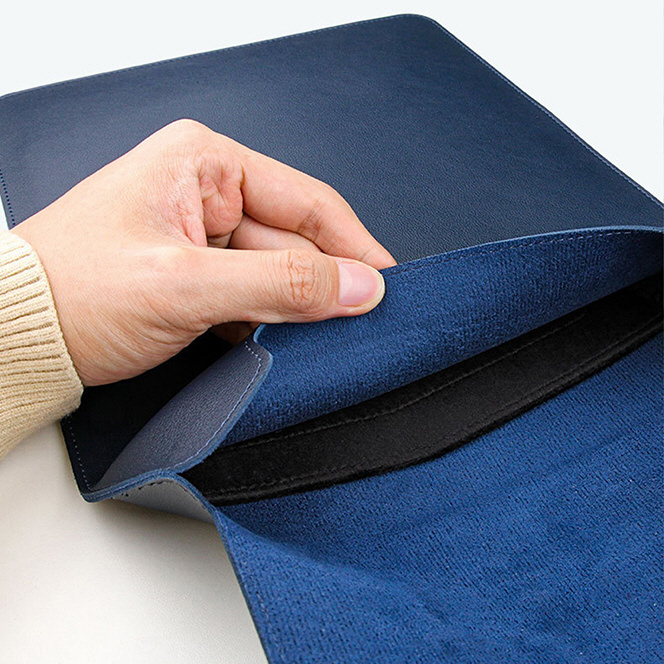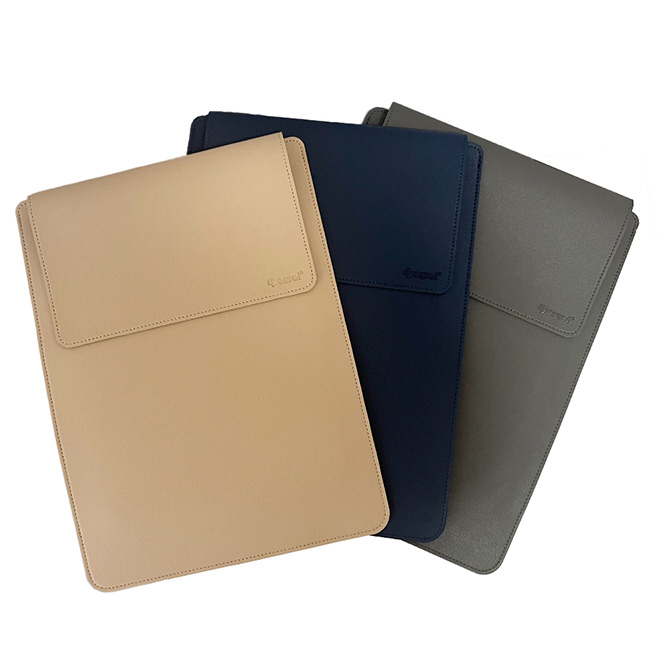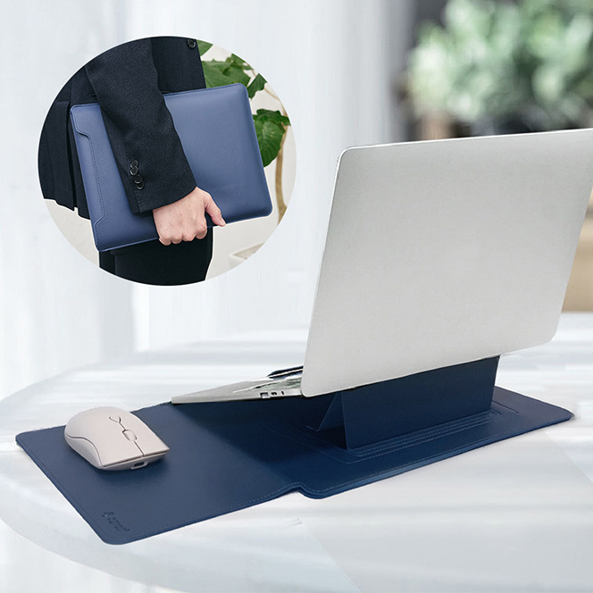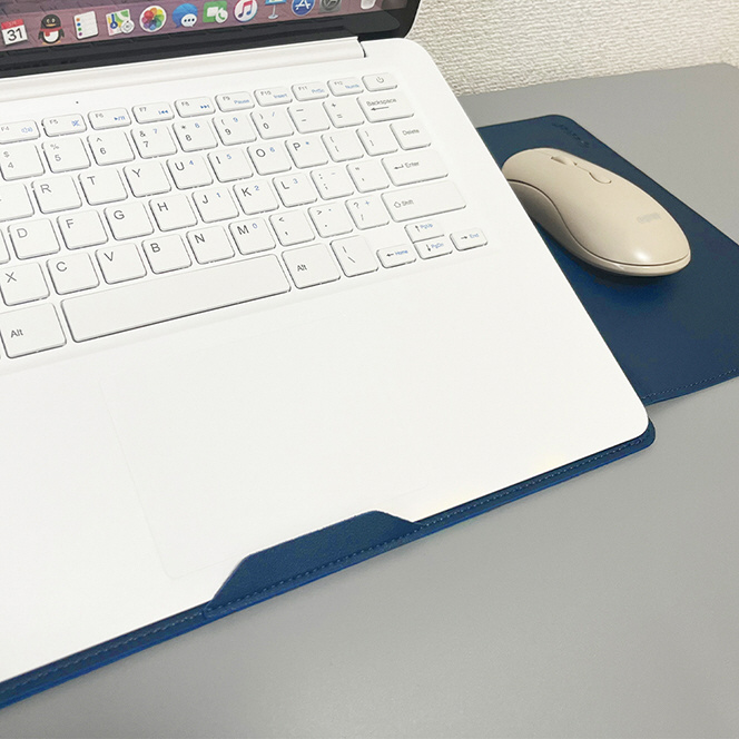 PUレザー製のシンプルでおしゃれなノートパソコン収納ケースで、マウスパッドやスタンド機能も兼ね備えた便利なアイテムです。