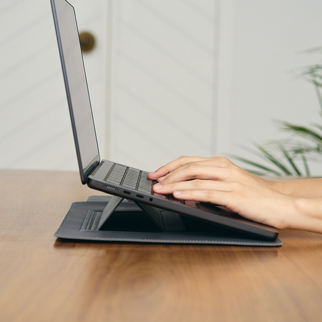 ノートパソコンを好きな角度に立てられるスタンド付きで、作業や視認性が向上