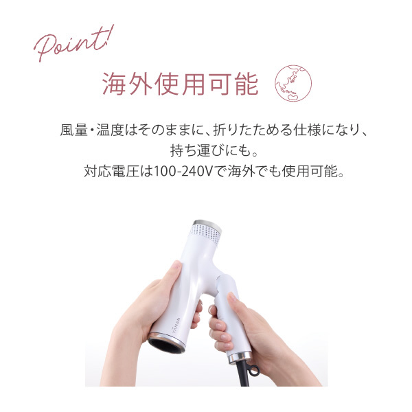『リフトドライヤー』の大風量・低温設計はそのままに、折りたたみ可能な形状へと進化しました。さらに、海外での使用が可能になったため、旅行先への持ち運びにも便利です。