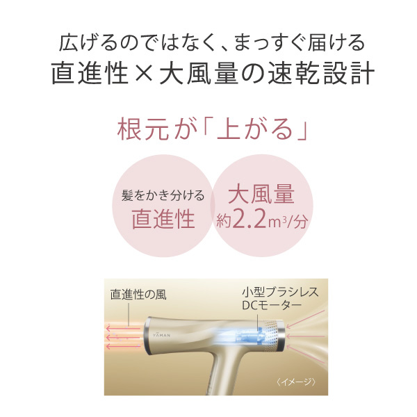 『リフトドライヤー』と同様に、温度や風量が異なるUP・SHINY・SMOOTHの3つモードを搭載。髪にとってダメージにもなり得る「熱」を上手く操り、ヤーマンが美髪に導くための最適解としてたどり着いた「熱×風」の組み合わせを3STEPに集約しました。中でもSHINYモードは、ダメージを低減しながらも、まるでヘアアイロンを通したような艶とまとまりを叶えます。「ドライヤーで髪の手触りが変わった」との声が多く寄せられており、その効果を実感いただいています。